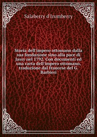 Аннотация к книге "Storia dell'impero ottomano dalla sua fondazione sino alla pace di Jassy nel 1792. Con documenti ed una carta dell'impero ottomano, traduzione dal francese del G. Barbieri" Salaberry d'Irumberry:Эта книга — репринт оригинального издания (издательство "Milano N. Bettoni", 1821 год), созданный на основе электронной копии высокого разрешения, которую очистили и обработали вручную, сохранив структуру и орфографию оригинального издания. Редкие, забытые и малоизвестные книги, изданные с петровских времен до наших дней, вновь доступны в виде печатных книг.